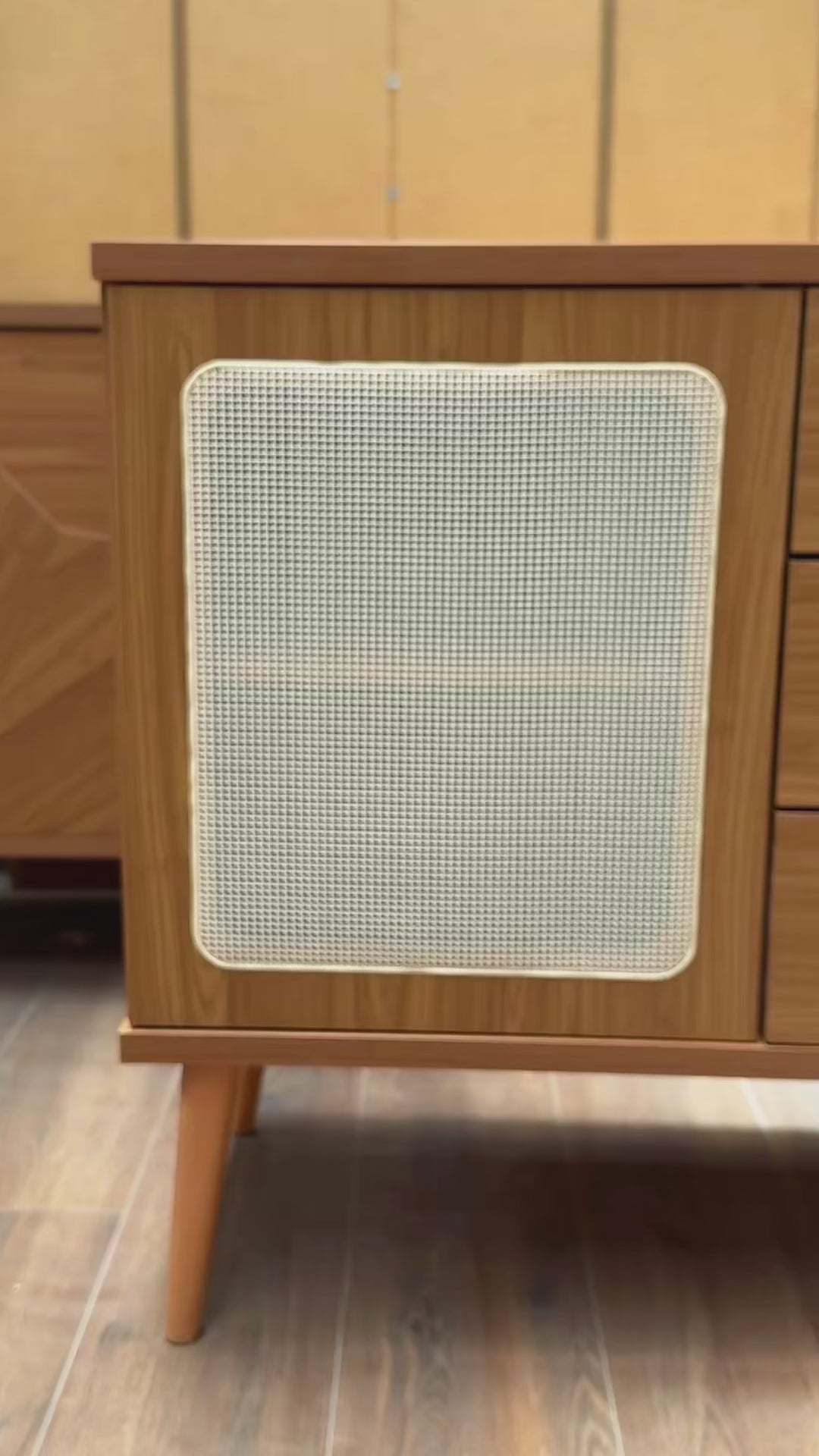 Sus dos puertas con delicados detalles en rejilla y sus tres amplios cajones centrales te entregan un espacio versátil para organizar con estilo, manteniendo siempre la armonía en tu hogar. Su diseño de líneas limpias y patas elevadas aporta ligereza visual, convirtiéndolo en un mueble que no solo ordena, sino que también decora.
