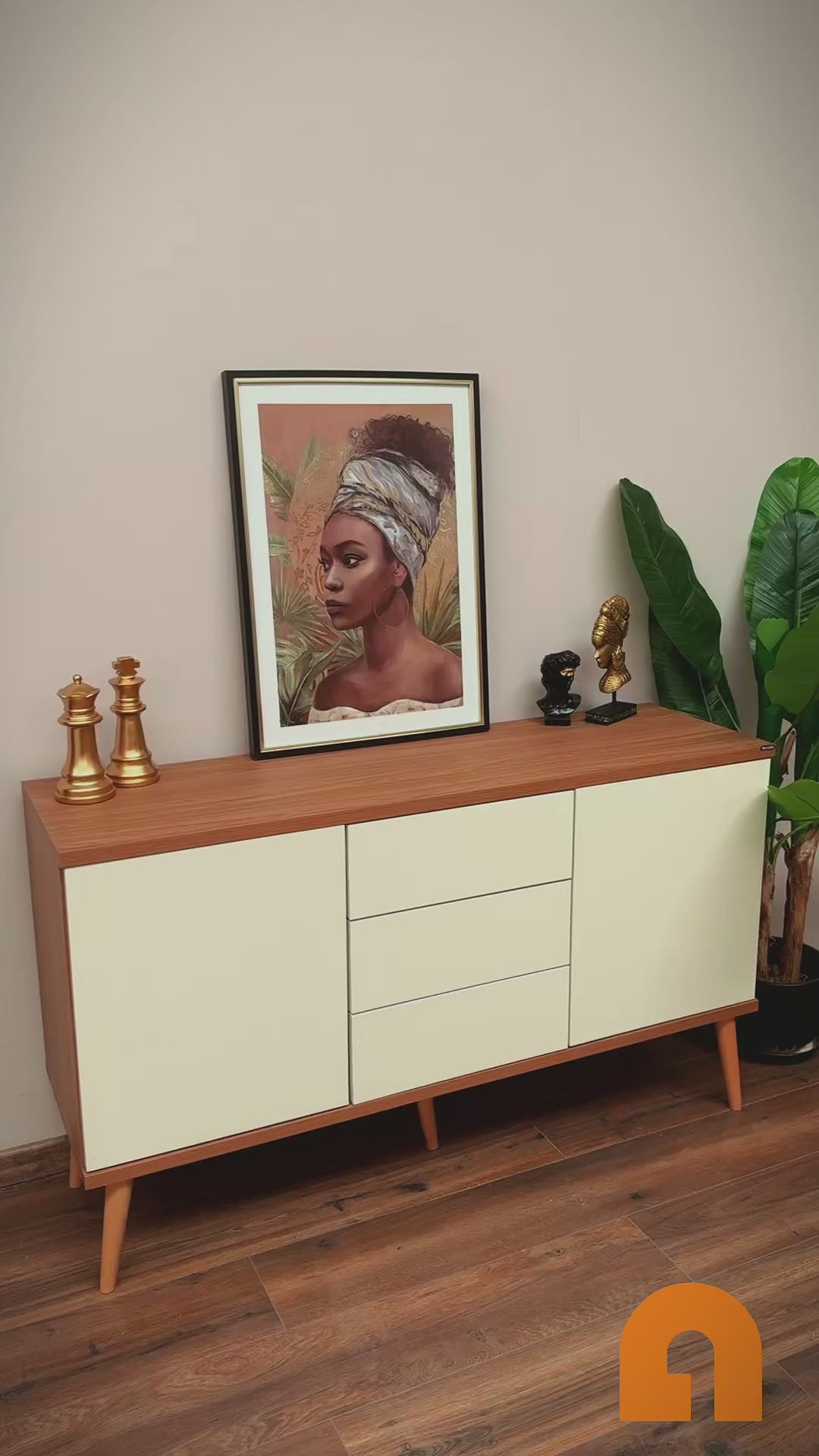 Con dos puertas amplias y tres cajones centrales, ofrece un almacenamiento cómodo y organizado, ideal para vajilla, mantelería o cualquier objeto que desees tener a mano. Sus patas elevadas le dan un aire liviano y contemporáneo, además de facilitar la limpieza diaria.