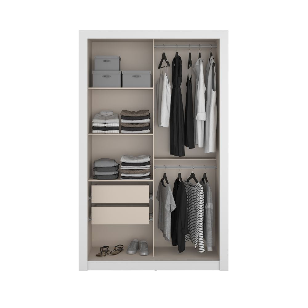 Con sus 2 puertas correderas, aprovecha al máximo el espacio disponible, siendo ideal para habitaciones de cualquier tamaño. En su interior, encontrarás una distribución práctica y organizada, con espacio para colgar ropa y 2 cajones integrados que permiten mantener ordenados accesorios, prendas pequeñas o lo esencial del día a día.