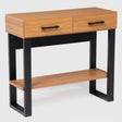 La calidez de su cubierta en tono madera natural contrasta armónicamente con la solidez del negro profundo de sus patas y detalles, creando un estilo contemporáneo y sofisticado. Sus dos cajones de amplias dimensiones permiten mantener el orden con estilo, mientras la repisa inferior añade un toque práctico y decorativo.