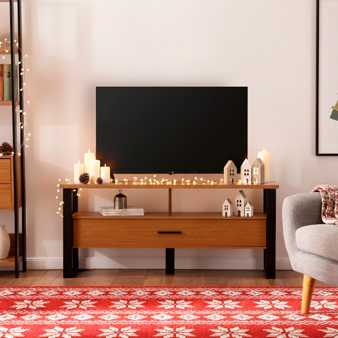 Dale calidez y estilo a tu living con el Rack Guayacán. Su diseño combina la nobleza del color de la madera con el estilo industrial del color negro, creando un mueble moderno y funcional. Está estructurado en MDF de diferentes espesores: 15, 18 y 25 mm. Con capacidad para televisores de hasta 60”, un amplio cajón con rieles metálicos y espacio abierto para organizar tus dispositivos, este rack no solo ordena, sino que transforma tu espacio en un lugar acogedor y con carácter.